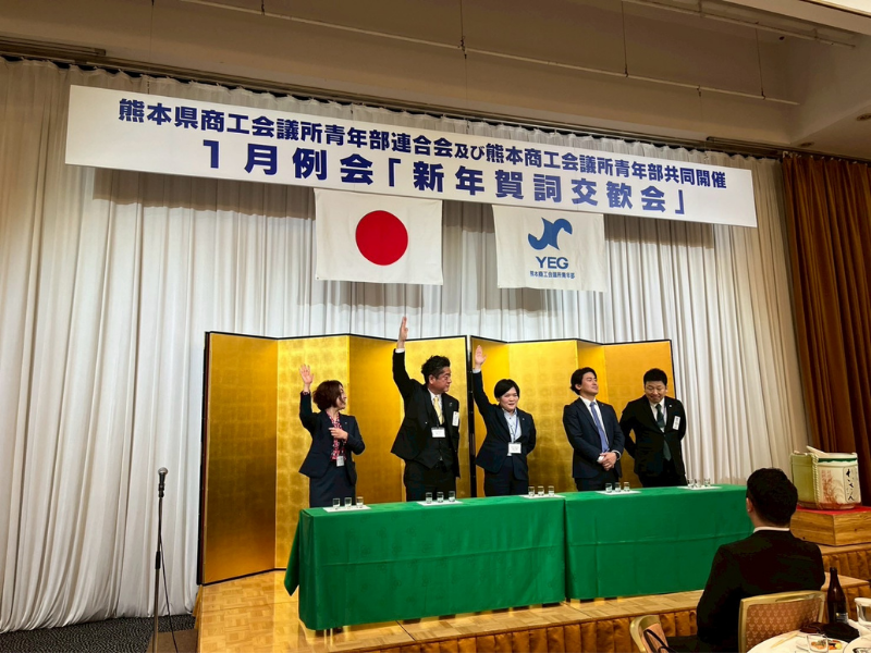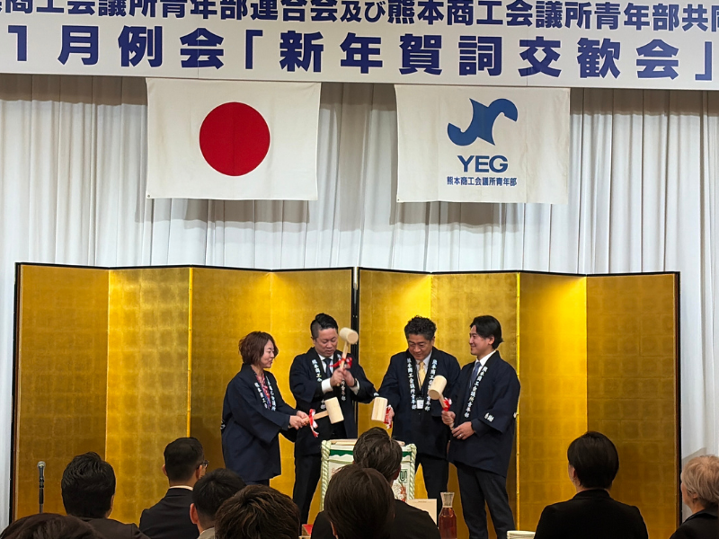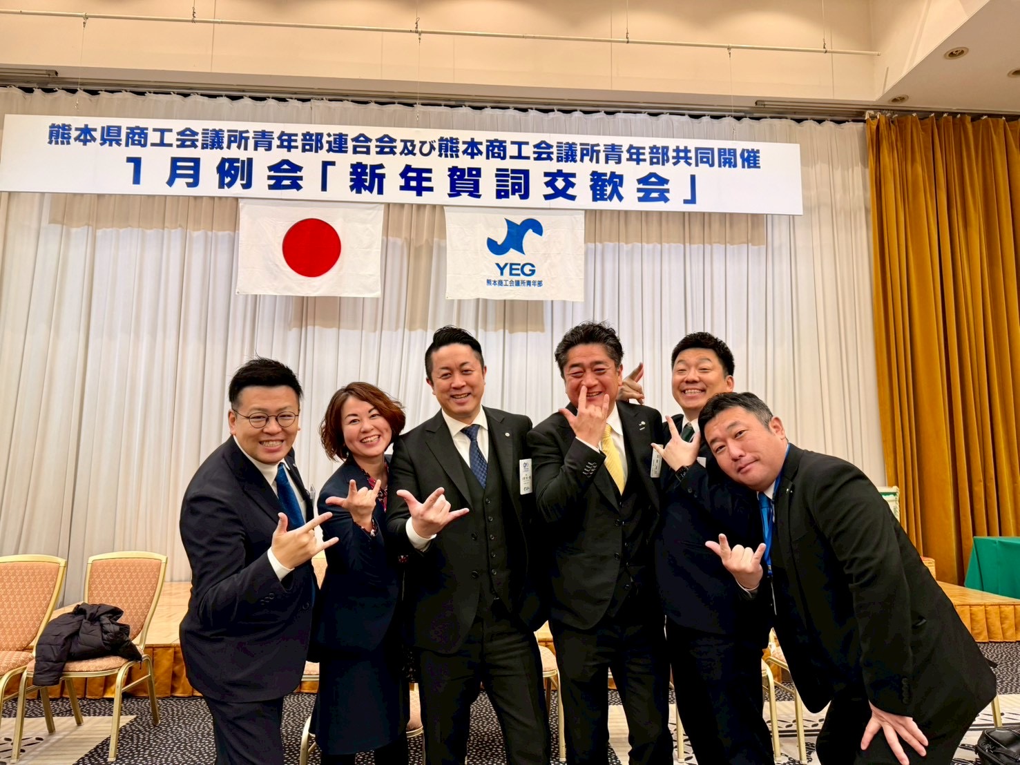 新年賀詞交歓会は、昨年と同様熊本県連 YEG との合同開催し、盛大な規模で開催をすることが出来ました。熊本 YEG と熊本県内外の YEG・支店長会・OB 会・女性会の皆様と幅広い交流の機会となりました。熊本県下 YEG メンバーの親睦も深めることができ、熊本県連としてより一層強い絆が創出できたのではないかと思います。